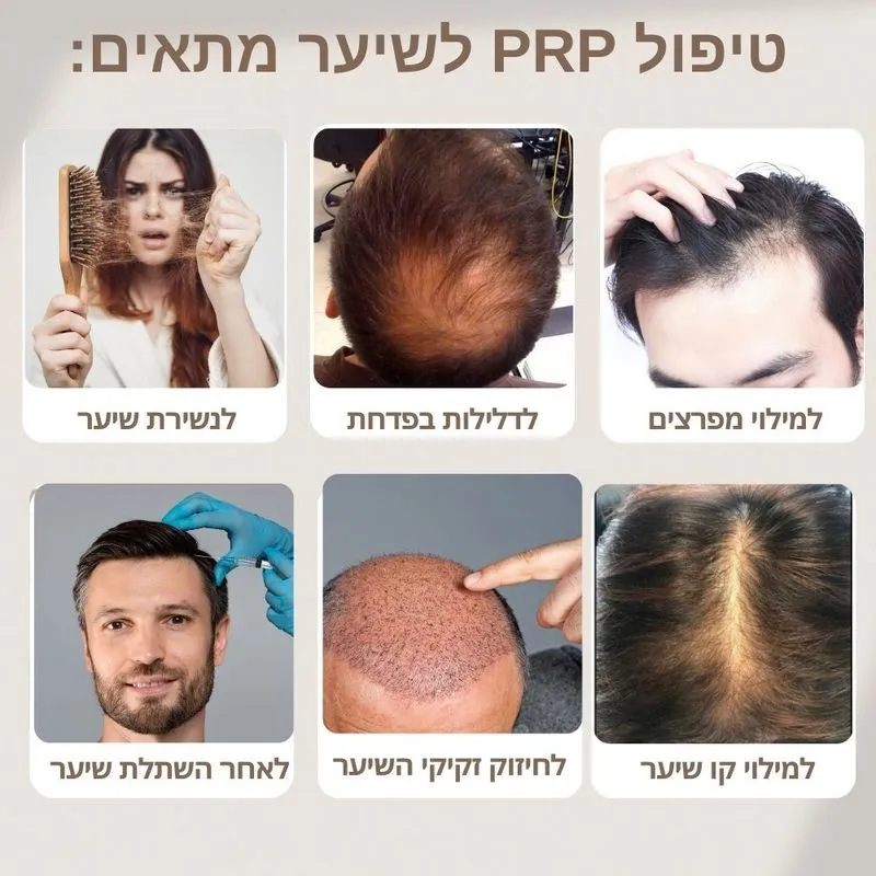 • שיקום לאחר השתלת שיער טיפול PRP יכול לשמש כתמיכה לאחר השתלת שיער, כדי לשפר את תוצאות ההשתלה ולעזור לשיער המושתל להתאקלם בצורה מיטבית. הוא מסייע בחיזוק השורשים החדשים ומעודד את צמיחתם.